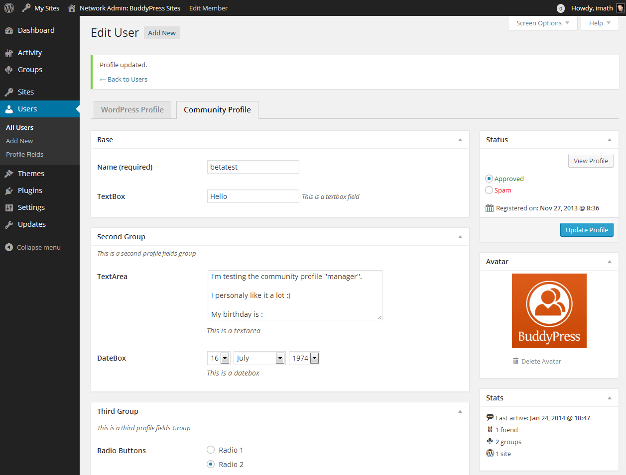 - Модифицирует некоторые существующие XProfile администратора / шаблон / фильтры, чтобы сделать его более удобным для запроса данных профиля за пределами традиционного отображаемого контекста BuddyPress.