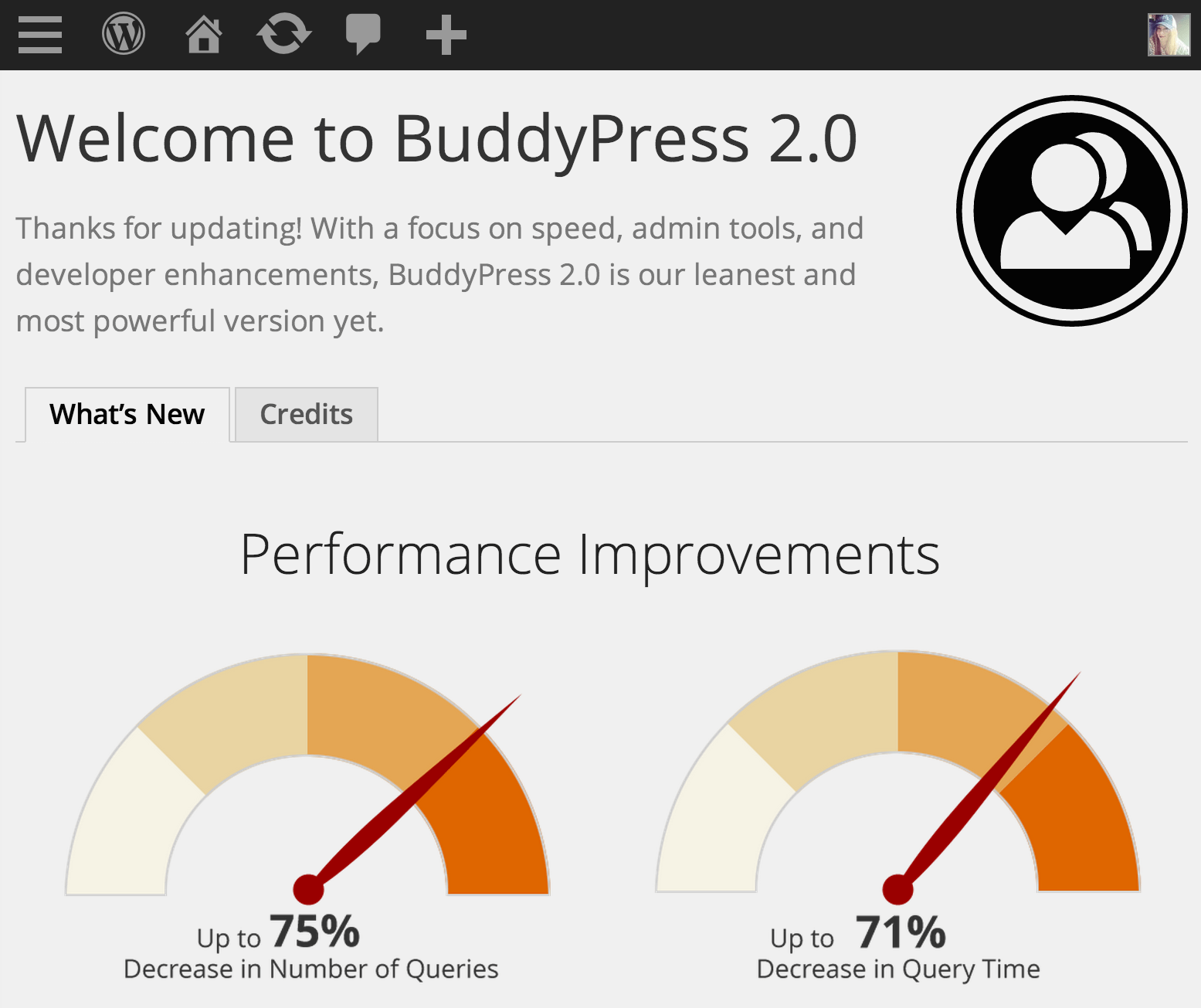 Одним из основных моментов этого релиза является массовое улучшение производительности,особенно в том, что касается членов и каталогов деятельности. BuddyPress 2.0 повышает эффективность MyS’L, уменьшая количество запросов до 75% и сокращая время запроса до 71%, в зависимости от хостинговой среды вашего сайта. Если ваш сайт использует передовые системы кэширования, такие как APC и Memcached, ожидать повышения производительности здесь, как 2.0 полностью капитальный ремонт, как они используются.
