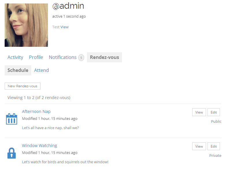 Rendez Vous это новый плагин, который позволяет членам сообщества планировать встречи друг с другом. Разработанный @imath, плодовитый автор плагина и BuddyPress основной вклад, Rendez Vous обеспечивает простую таблицу для каждого пользователя, чтобы отметить его наличие для предлагаемого рандеву.