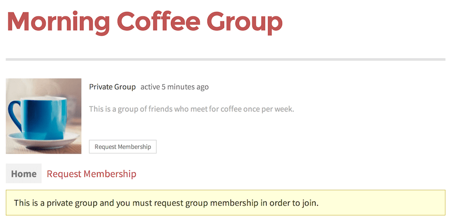 Последний вариант, включенный в плагин, это удобный способ создать простую домашнюю страницу, которая будет отображаться при просмотре группы, не являющаяся участниками.