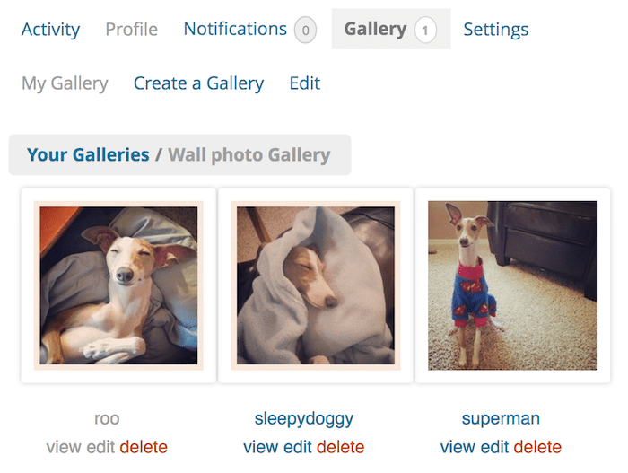 Поддержка галереи MediaPress очень похожа на Facebook. Изображения, загруженные через поток активности, будут размещены в фотогалерее, где пользователи могут просматривать, отсвагрывать или удалять их.