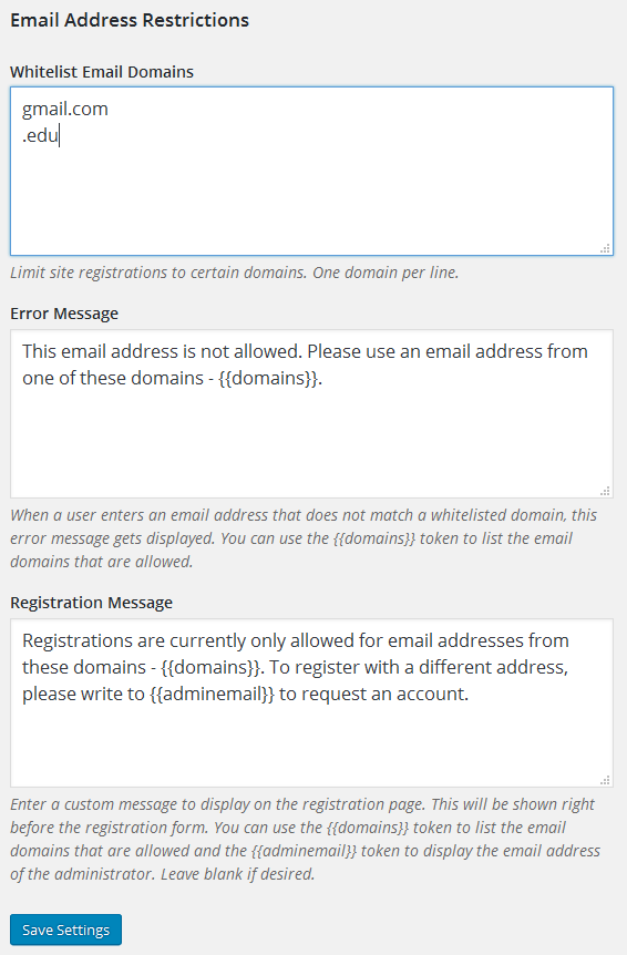 Не каждый социальный сайт может позволить себе ограничить домены электронной почты, но этот плагин хорошо работает для академических сайтов, некоммерческих или других типов организаций, или любого сообщества, которое исключает все, кроме нескольких набор доменов электронной почты. BP Ограничение Регистрация по электронной почте домена является открытым исходным кодом на WordPress.org и активно поддерживается для использования на CUNY.