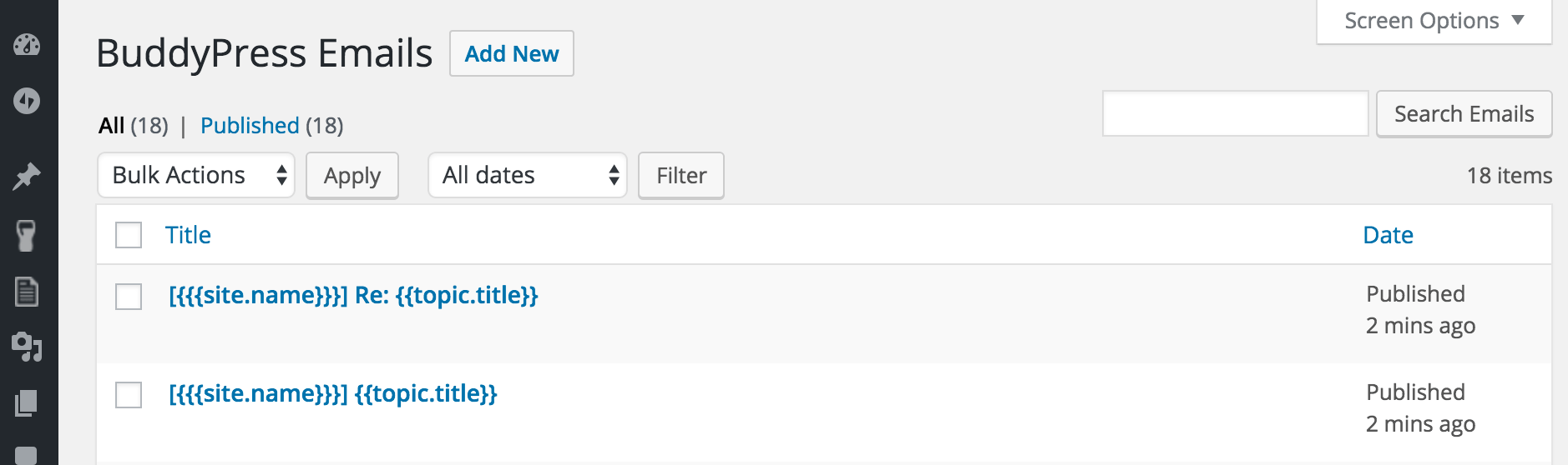 После установки, администраторы найдут шаблоны для новых тем форума и темы ответов под тем же пунктом меню emails с 16 настраиваемых BuddyPress основных писем.