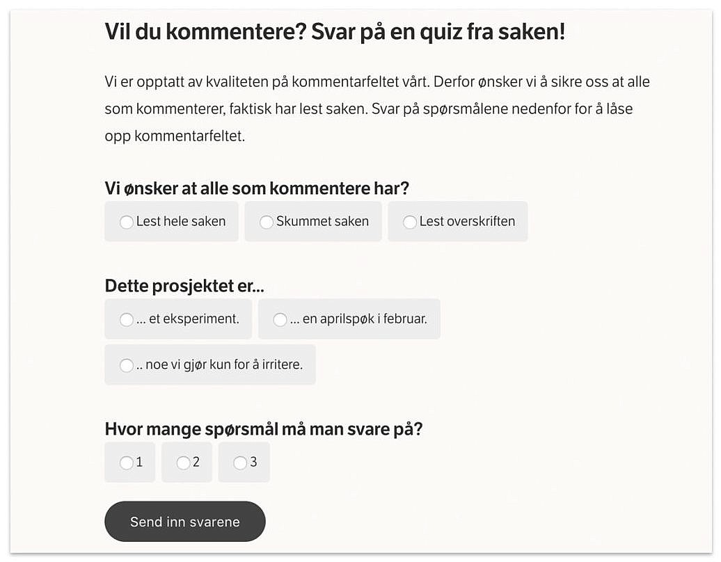 NRKbeta новый комментарий викторины плагин занимает несколько иной формат, предлагая несколько вариантов в виде радио кнопок, а также возможность добавить несколько вопросов. Форма комментария автоматически скользит в поле зрения после правильного ответа посетителя.