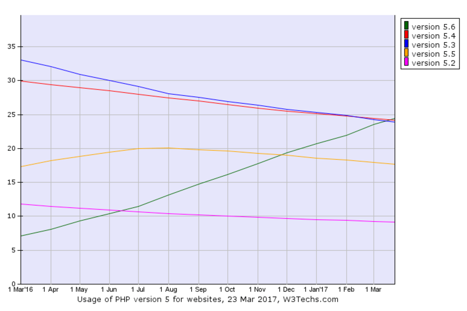 Обгонять старые версии PHP 5.6 является важной вехой для сообщества PHP, так как он по-прежнему получает поддержку по критическим вопросам безопасности до 31 декабря 2018 года. Старые версии, которые ранее доминировали использования достигли конца жизни в 2015 и 2016 годах и больше не получают обновления безопасности.