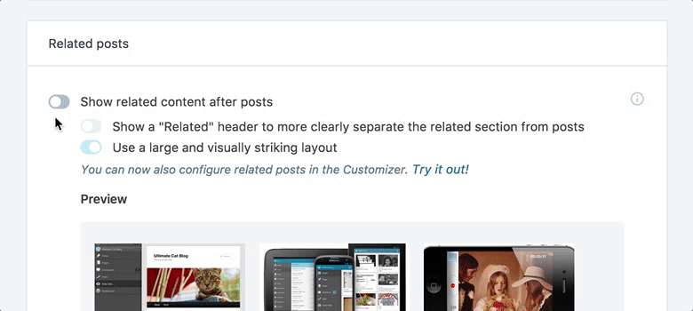 Арестад сказал, что он был вдохновлен тем, как мобильные устройства обрабатывают настройки, особенно то, как они редко включают кнопку «Сохранить», если это не вариант, который не является простым переключением. Команда разработчиков Jetpack применила это к экранам настроек, чтобы большинство из них теперь были автосохранены.