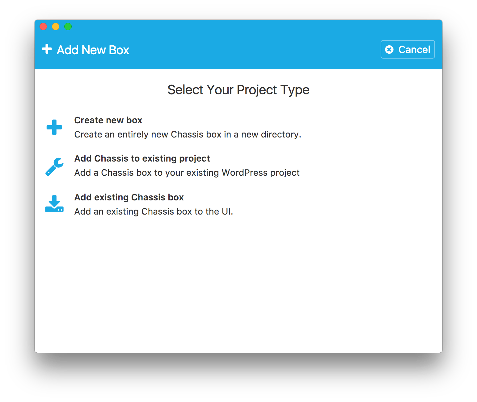При первом запуске приложение гарантирует, что Vagrant и VirtualBox установлены, а затем направляет пользователя для создания новой коробки. Настройка новой установки шасси или добавление шасси к существующей установке быстро и легко с помощью простого uI. Приложение также включает в себя клавиатуру навигации и встроенный терминал для быстрого доступа к большему контролю над вашей коробке.