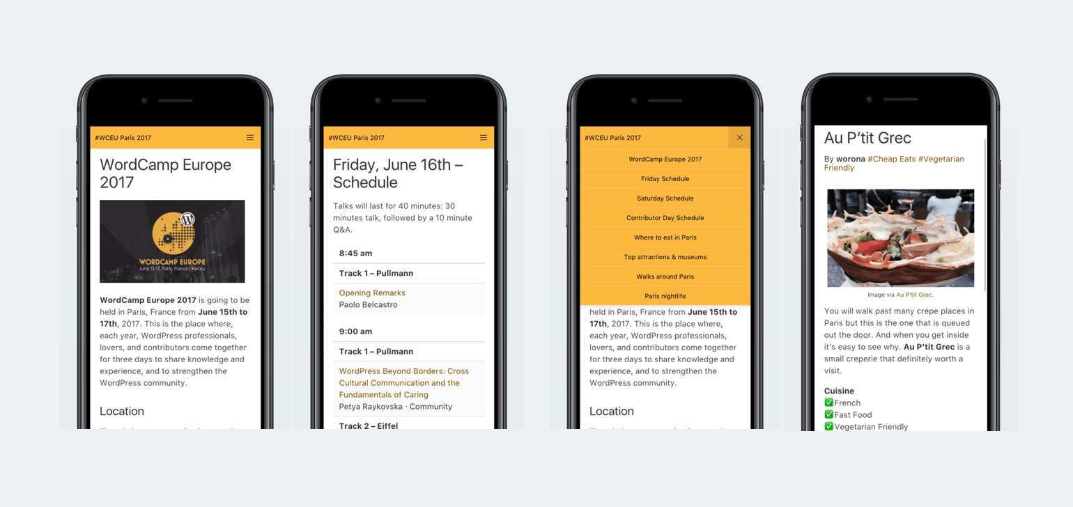 Worona в настоящее время команда из пяти человек, в том числе два соучредителя, специалист по маркетингу, и два полный стек разработчиков. Большая часть команды будет на WordCamp Европе. Они надеются, что приложение WCEU Paris Guide будет полезно для посетителей, а также обеспечить хорошее введение в их продукт. Если у вас есть какие-либо отзывы, которые сделали бы приложение более полезным, убедитесь, что комментировать объявление и Worona может быть в состоянии включить предложения пользователей до события.