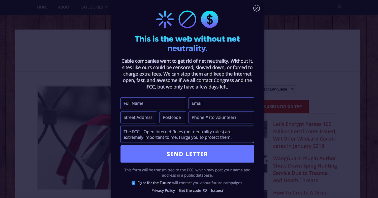 Предупреждение призывает посетителей связаться с Конгрессом и FCC через предоставленную форму. Он может отображаться как баннер в верхней части страницы или в качестве модального (см. пример выше).