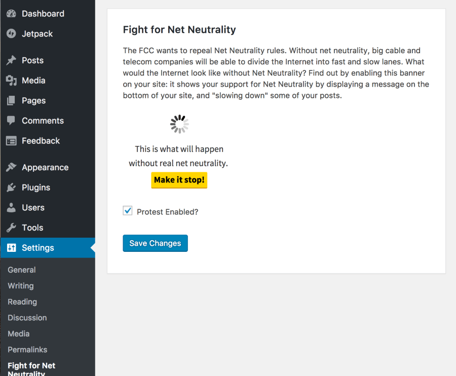 Плагин с открытым исходным кодом и доступен для самостоятельно размещенных пользователей на WordPress.org. В отличие от существующих плагинов, которые поддерживают событие 12 июля, представляя посетителям баннер для повышения осведомленности, плагин Automattic имитирует то, что жизнь может быть, как в «медленной полосе», если FCC отказывается от принципа сетевого нейтралитета. Он заменяет несколько сообщений на вашем сайте с «Все еще загрузка» счетчик. Этот плагин, кажется, не предлагает способ проверить его перед событием, но он по существу отображает сообщение в нижней части вашего сайта и замедляет некоторые из ваших сообщений.