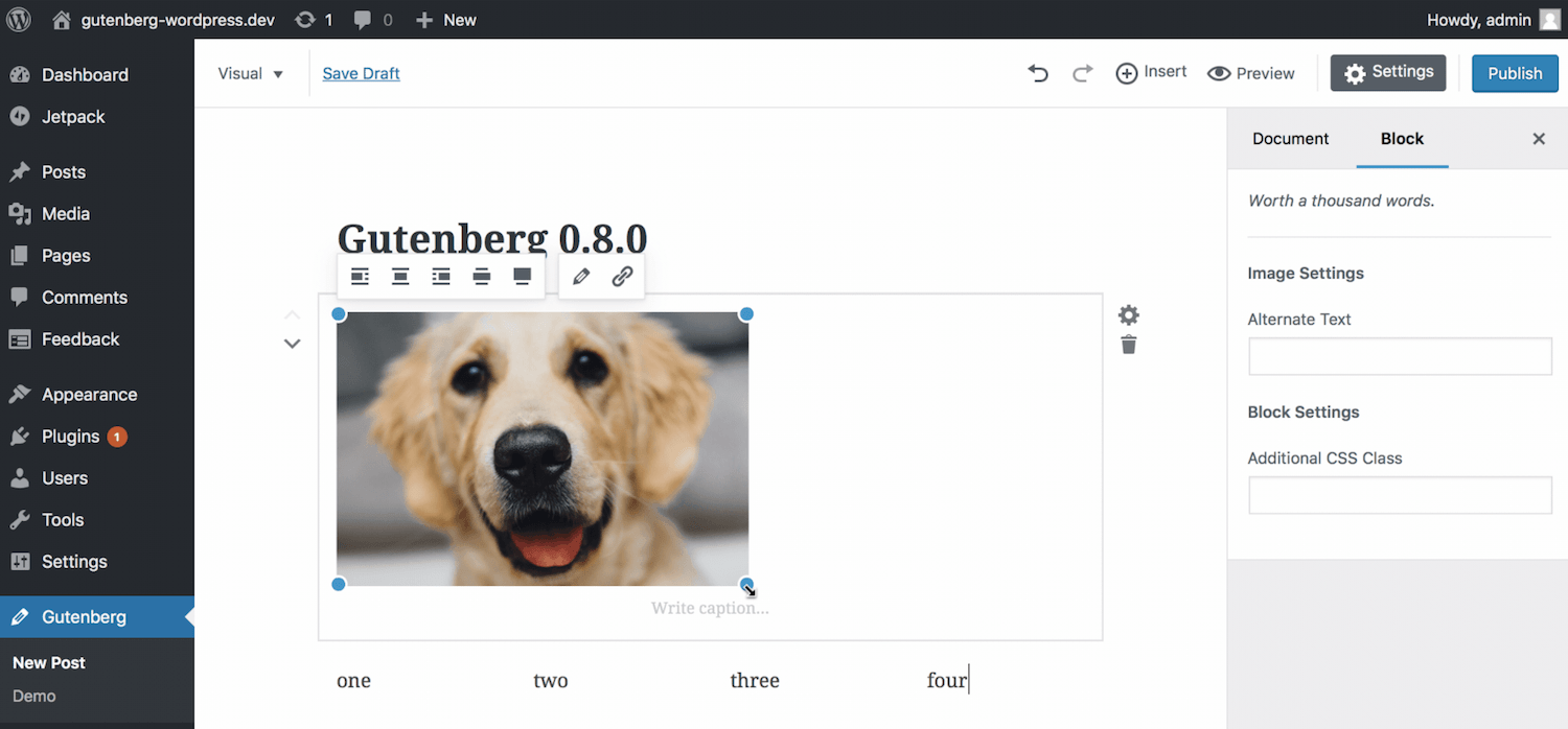 Gutenberg 0.8.0 добавляет обработчики размеров в существующий блок изображений, что упрощает для пользователей вставку и быстрое изгабаритное изображение. Если вы просмотрите билет GitHub на эту функцию, становится ясно, что его было непросто реализовать. Изображение изменения прошла через несколько изменений и, возможно, больше вниз по дороге, тем более, что она относится к поведению подписи. В конечном счете, поле подписи не должно быть шире изображения, чтобы они были расположены вместе.