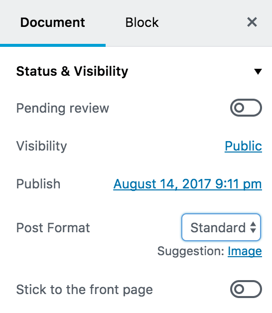 Этот релиз вводит селектор форматов публикаций в боковой панели настроек post. Она включает в себя предложение, основанное на том, какие блоки используются в этой должности. Один из участников билета отметил, что это предложение придает слишком большое значение выбору форматов постов и может ввести пользователей в заблуждение. Предложение сохраняется, несмотря на то, что пользователь переключил формат на предложенный. Это происходит потому, что Гутенберг не может определить, был ли он явно установлен пользователем или если пользователь выбрал предложение.