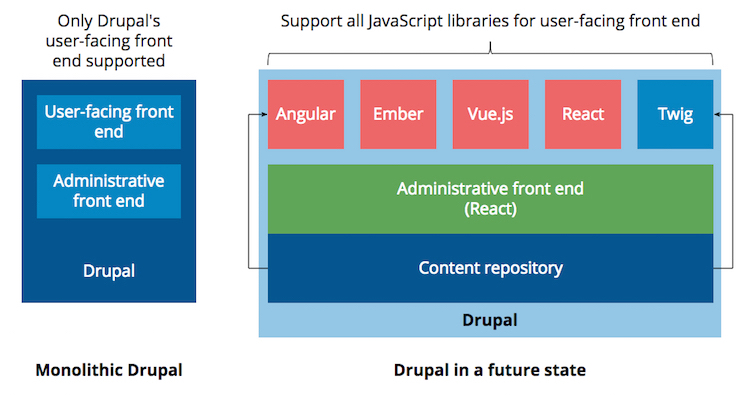 Два года назад Drupal исследовал ассоциированную платформу JavaScript и в то время Buytaert рассматривал React, Ember и Angular. Патентная оговорка Facebook в лицензировании React заставила его не решаются захотеть использовать его для Drupal, но с тех пор лицензия была изменена на MIT. Сообщество Drupal не было готовы выбрать рамки в то время и в ответ Buytaert решили сосредоточиться на улучшении Веб-сервис Drupal AIS вместо.