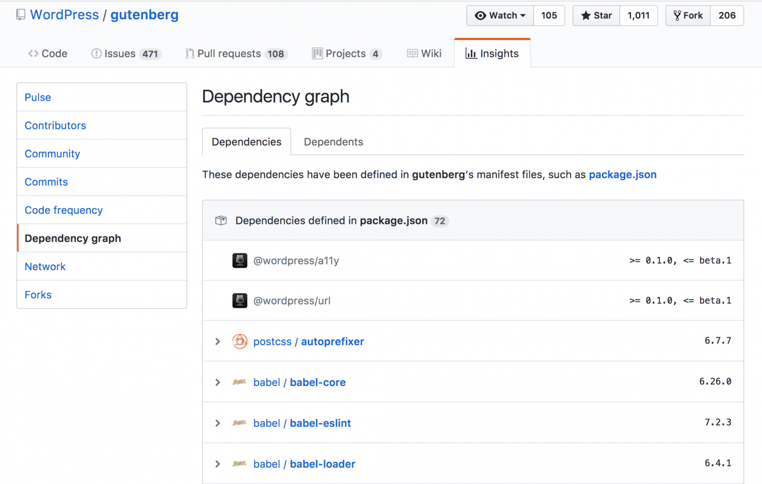 Публичные репозитории отображают график по умолчанию, и владельцы частных репозиторий также имеют возможность включить его. Ниже приведен скриншот графика зависимости Гутенберга: