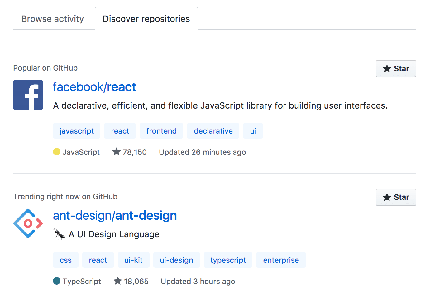 GitHub также запускает новые усилия, чтобы соединить свое массовое сообщество. Компания сообщила о 24 миллионах разработчиков, работающих в 67 миллионах репозиторий в 2017 году. Новые функции сообщества направлены на то, чтобы помочь разработчикам установить значимые связи в обширном море хранилищ на платформе. Пользователи заметят новый канал «Откройте для себя репозитории» в своих панелях мониторинга, который дает рекомендации на основе их звездных репозиториев и людей, которых они следуют.