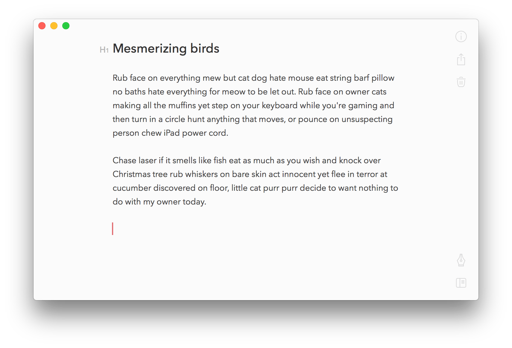Bear сочетает в себе лучшие возможности приложения для заметок с приложением для записи. Пользователи могут включить режим Focus, используя нижнюю правую иконку, которая скрывает боковую панель и список заметок, чтобы обеспечить более минимальное пространство для записи. Bear экономит записи пользователей в режиме реального времени, предлагает поддержку изображений в строке строки и выделение синтаксиса для 20 языков программирования. В то время как пользователь сочиняет, нет никаких отвлекающих факторов, так как редактор мгновенно отображает богатые предварительные просмотры. Легко понять, почему Медведь стал мгновенным фаворитом.