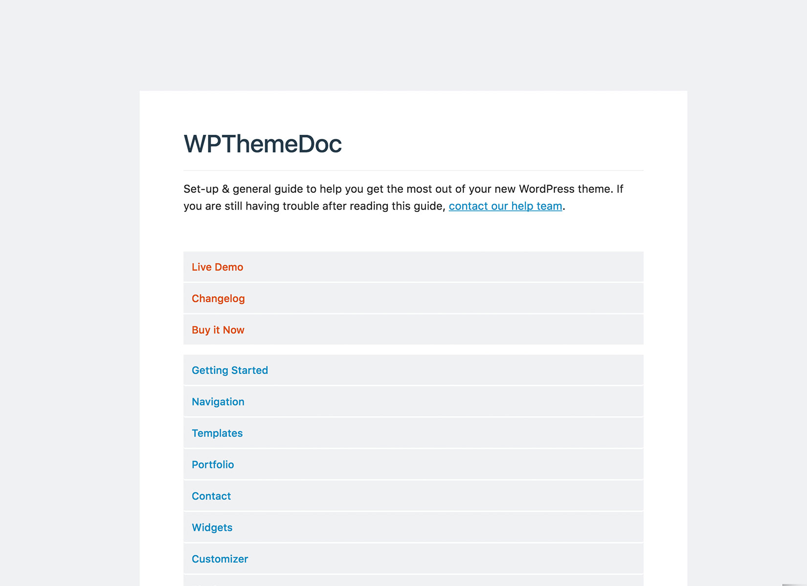 WPThemeDoc аккуратно организован и прост в навигации. Он может быть использован без каких-либо изменений дизайна или в качестве отправной точки для вашего собственного дизайна фирменной документации. Проверьте живой демо документирования Tabor’s York Pro тему.