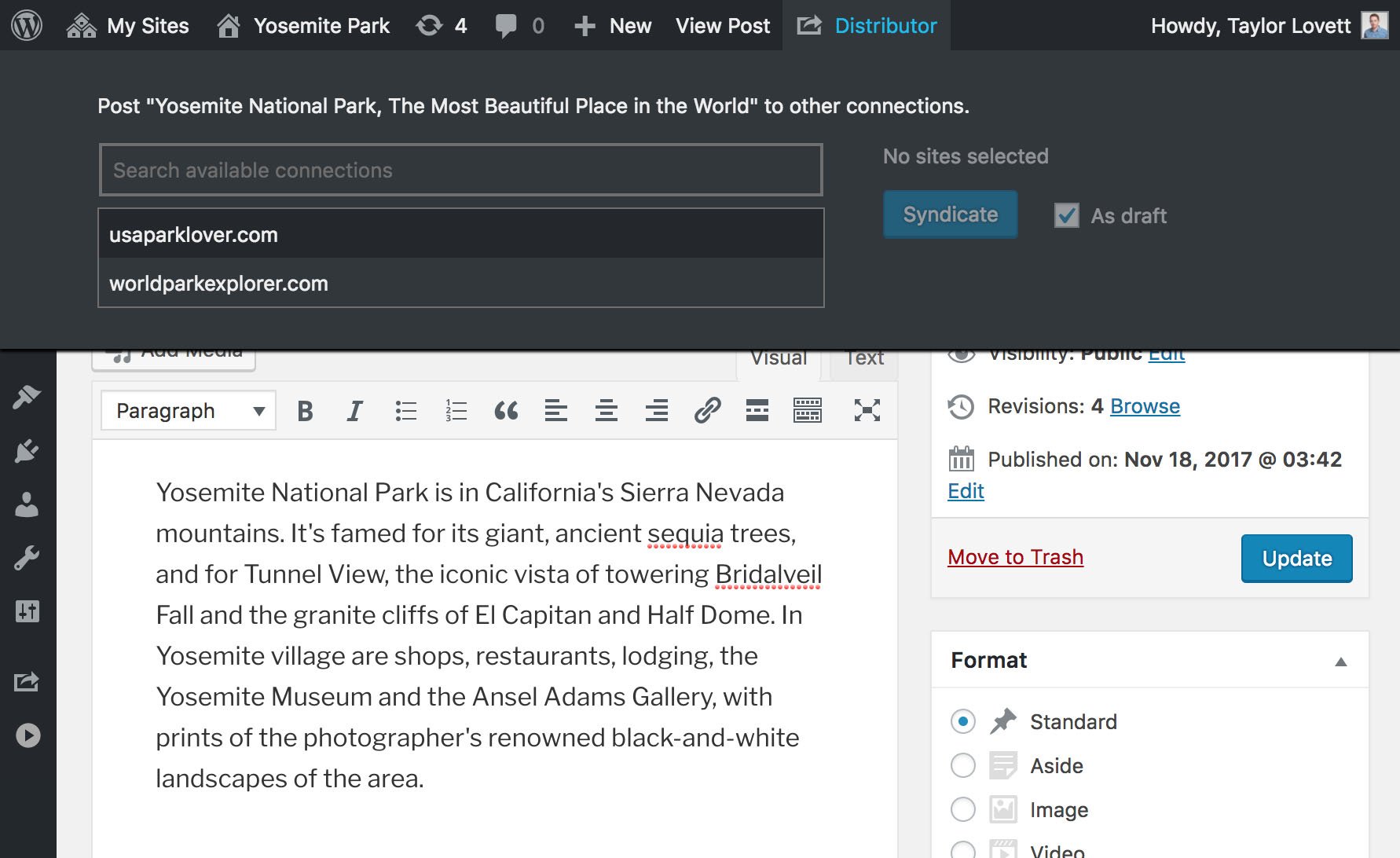 «На самом деле, Дистрибьютор проверяет, какие сайты поддерживают тот же тип поста и термины, прежде чем он предлагает список сайтов, которые вы можете «распространять» содержание (так что вы не можете «распространять» продукт WooCommerce на сайт, не работает WooCommerce), «сказал он. Продажа одних и тех же продуктов в нескольких магазинах с автоматическим обновлением запасов и изменениями цен является лишь одним из многих интересных вариантов использования для Дистрибьютора.