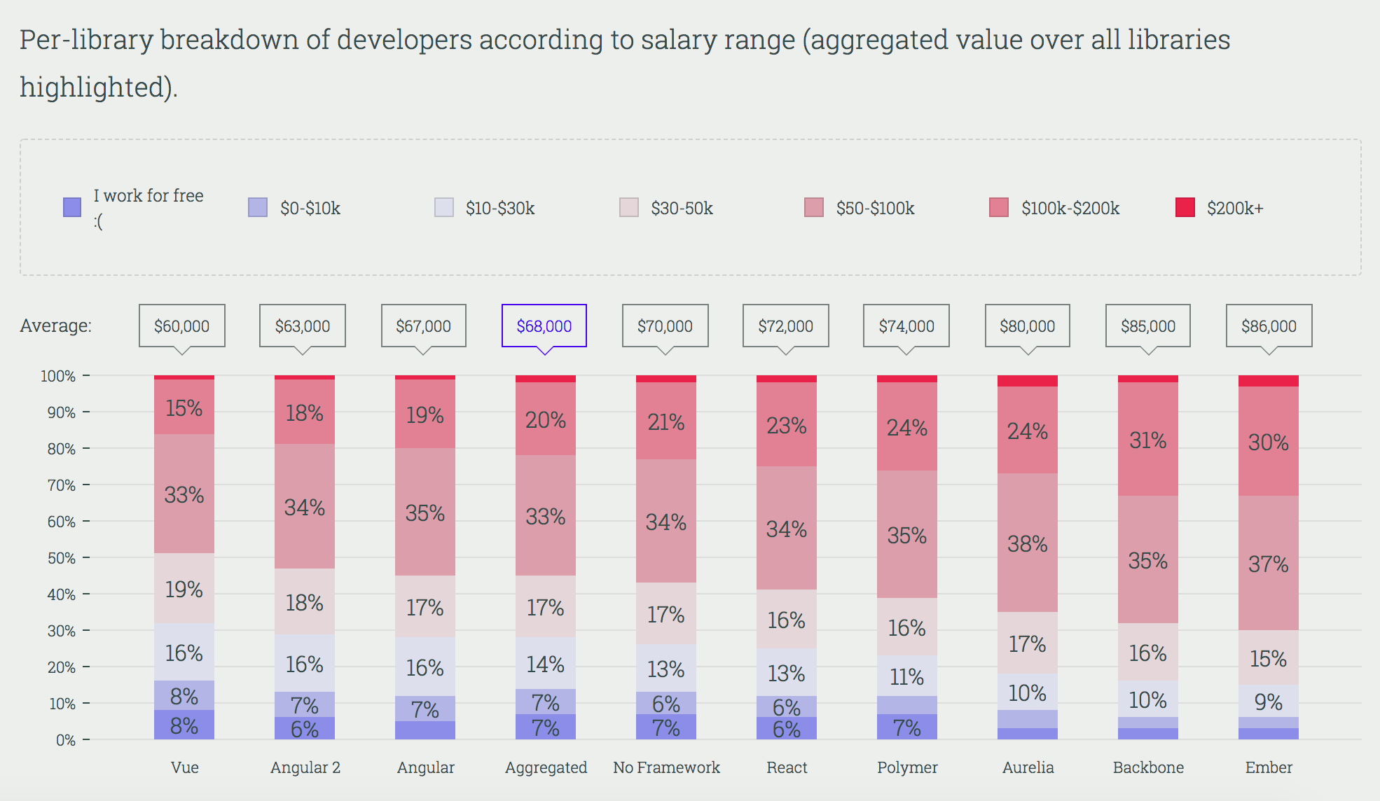 Данные о заработной плате особенно полезны для соискателей или тех, кто новичок в JavaScript, которые пытаются решить, какие библиотеки изучать. Хребет и Эмбер командовали наивысшей зарплатой для участников, с Vue и Angular 2 в ближайшие на нижнем конце.
