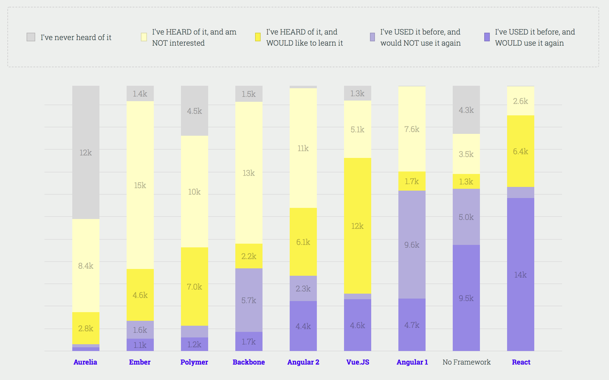 В прошлогоднем опросе приняли участие более 20 000 человек, что на 115% больше, чем в предыдущем году, когда было получено 9300 ответов. В популярной категории фронтовых рамок React снова победила в качестве основы с наибольшим числом респондентов, указывающих на то, что они использовали ее и будут использовать его снова.