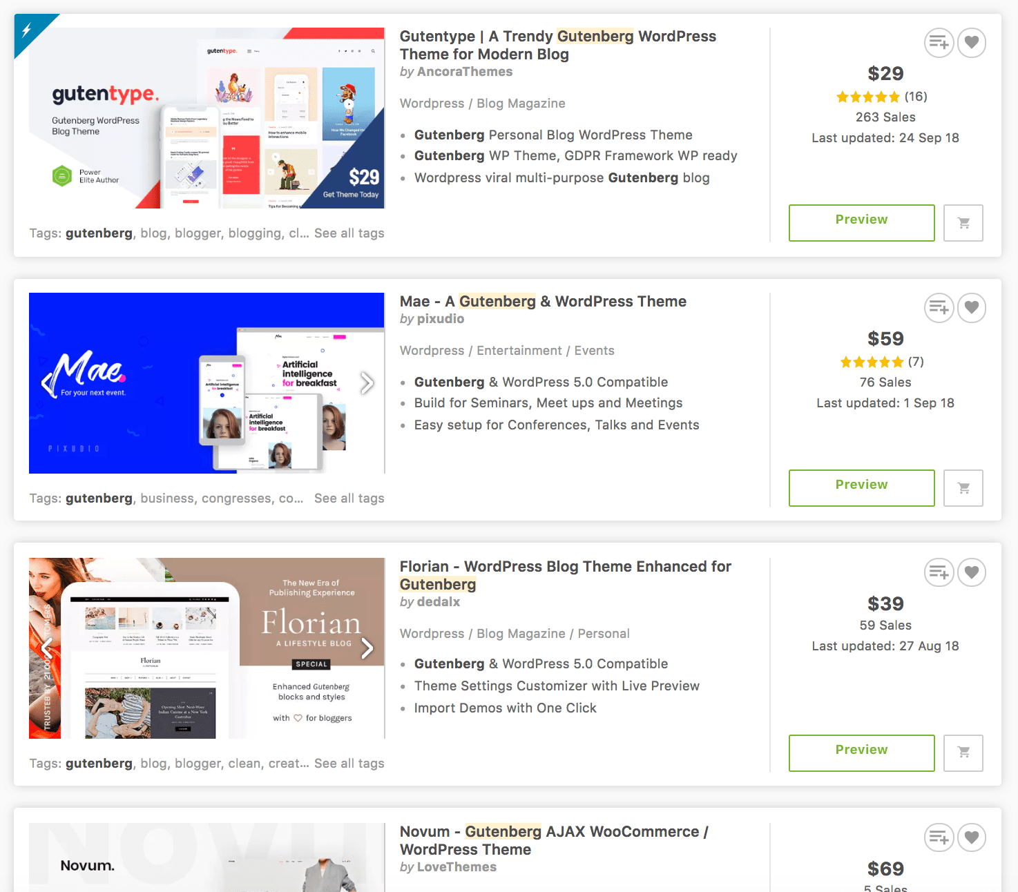 Гутенберг совместимости, как представляется, более модным словом среди большинства списков Themeforest, указывая, что тема включает в себя стили для всех основных блоков. Однако в некоторых случаях авторы темы также тестировали короткие коды на совместимость с новым редактором. Меньшее число включает доступ к премиум-блокам как часть их рекламируемой совместимости Гутенберга.