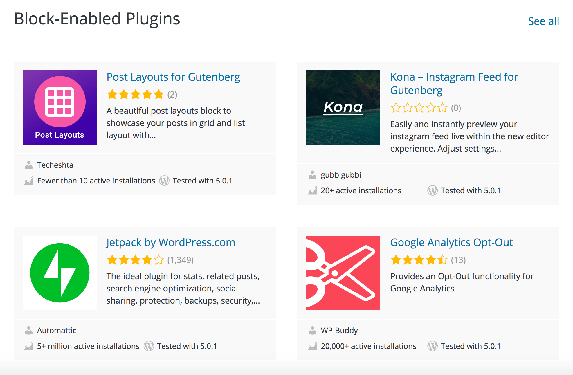 Каталог, полностью посвященный блокам, также может быть WordPress.org в следующем году. В недавнем посте, Мэтт Mullenweg определены 9 проектов на 2019год , в том числе «строительство WordPress.org каталог для обнаружения блоков, и способ легко установить их». Это гораздо большая задача и требует WordPress ответить на несколько вопросов: Будут ли плагины по-прежнему основным механизмом доставки для блоков? Или WordPress.org будет внедрять систему, в которой пользователи могут загружать только блоки JS, аналогичные проекту Gutenberg Cloud?