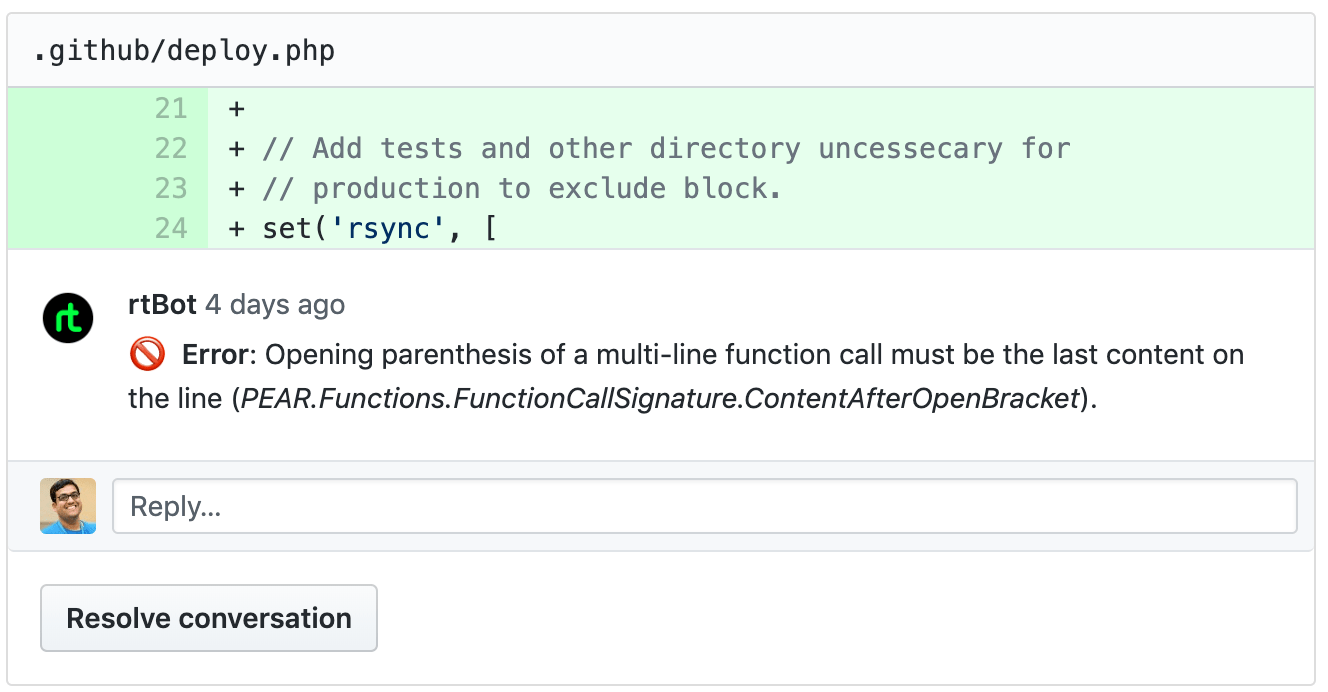 Действие PHPCS Code Review использует функцию проверки запроса на вытягивание GitHub. Он выполняет автоматизированный обзор кода по запросам на вытягивание с помощью PHPCS. Это действие основано на WordPress.com VIP GPL-лицензированных сценариев обзора.