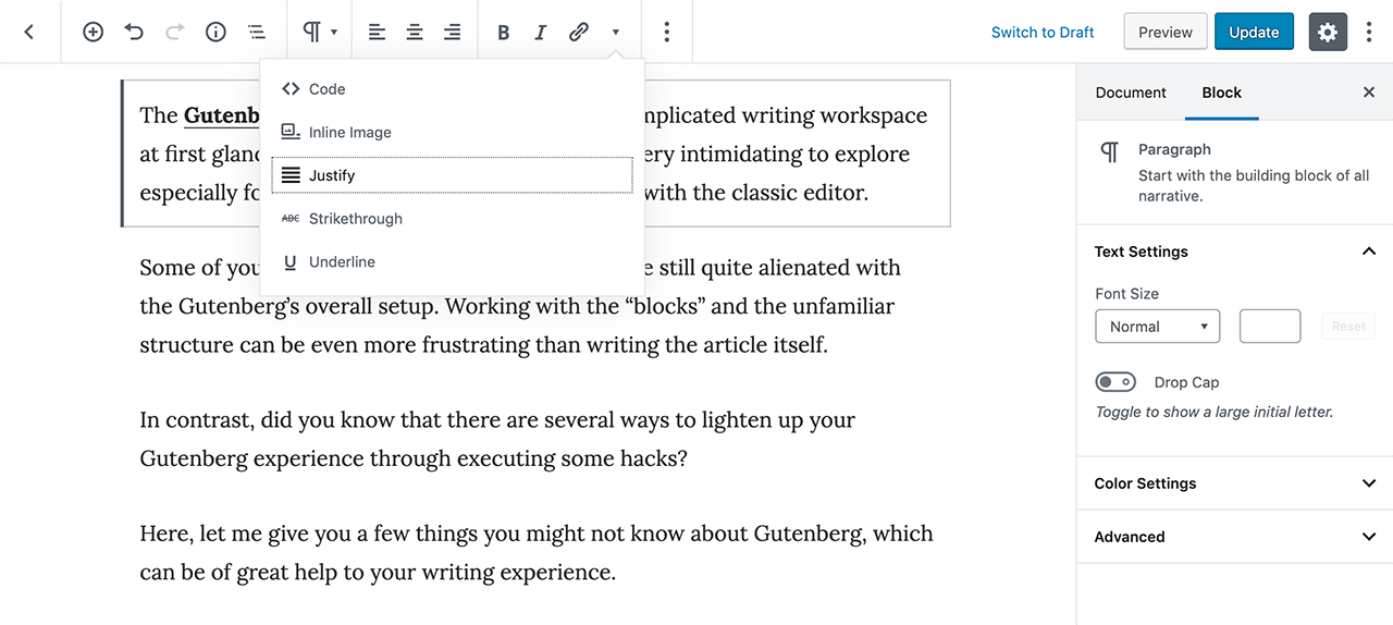 Этот релиз также добавляет подчеркнуть и оправдать параметры выравнивания в блок епараграфа. Гутенберг не включает его по умолчанию, так как WordPress 4.7 удалил кнопку оправдания из редактора TinyMCE в 2016 году. Однако требование обоснованного текста не исчезло.