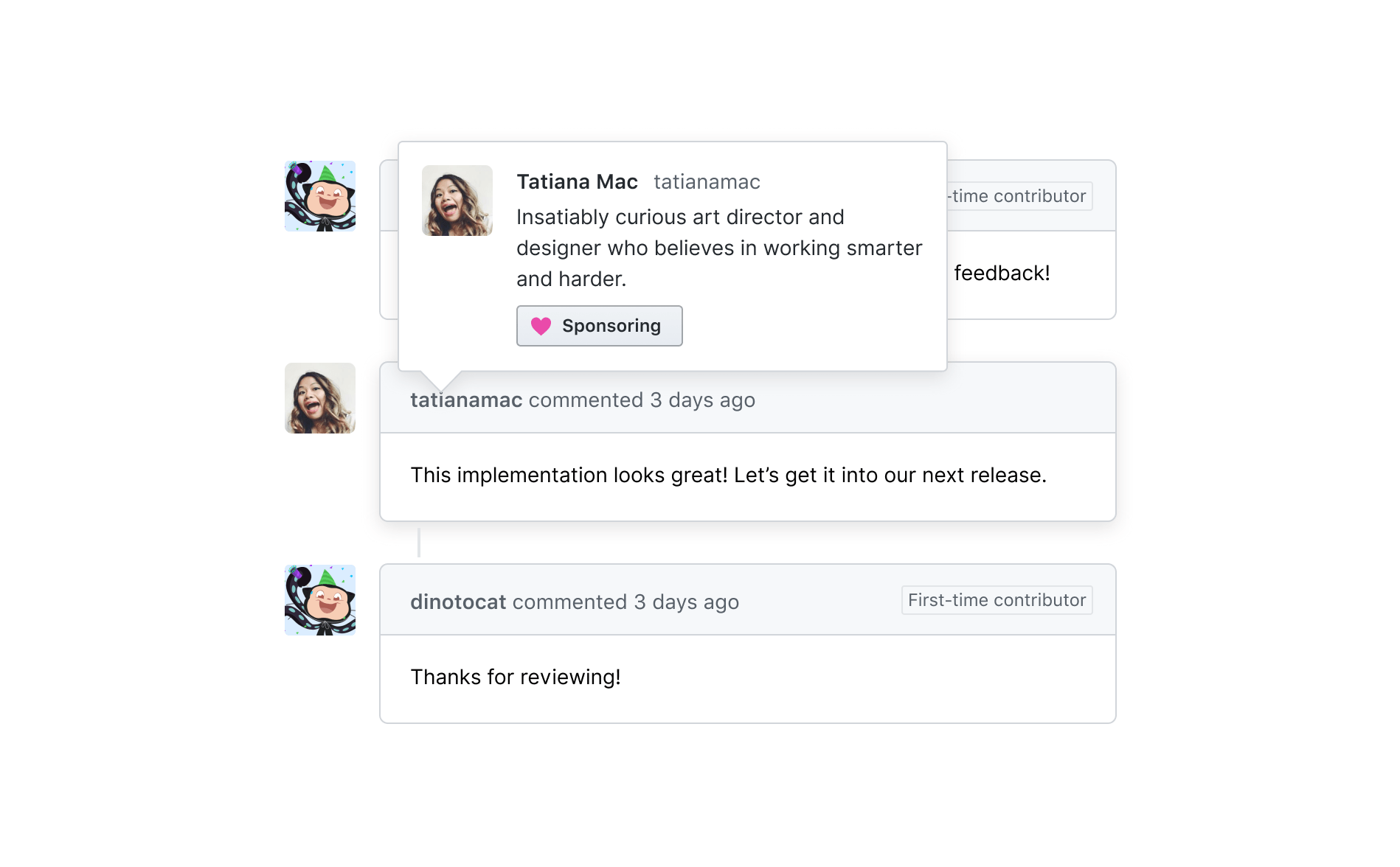 «Теперь вы можете спонсировать разработчиков в качестве бесшовной части вашего знакомого рабочего процесса,» GitHub с открытым исходным кодом менеджер проекта Девон Квегель сказал в объявлении. «Когда участник отвечает на ваш вопрос, сортирует ваш вопрос или сливает ваш код, вы можете отправиться в их профиль или просто навести насебянии над их именем пользователя, чтобы спонсировать их работу».