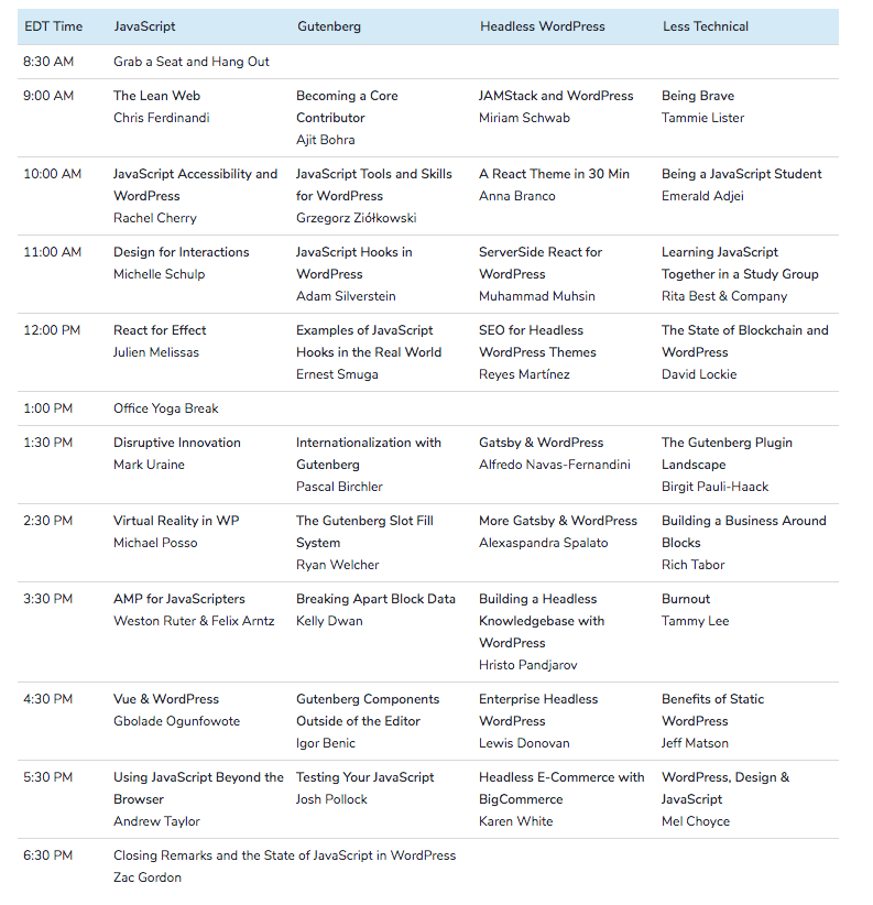 Гордон опубликовал окончательный график для 36 сессий и ораторов, которые будут транслироваться в пятницу, 12 июля. В этом году мероприятие будет включать в себя один трек, посвященный изучению тем, окружающих «безголовый WordPress», подход, который избегает WordPress ‘традиционной архитектуры в пользу разъединения передней и задней, что позволяет разработчикам интегрировать различные Стеки. Трек включает в себя презентации, как Реагировать Тема в 30 мин, SEO для безголовых WordPress Темы, Гэтсби и WordPress, и безголовый электронной коммерции с BigCommerce. Другие треки имеют более общие темы JavaScript и Гутенберга.