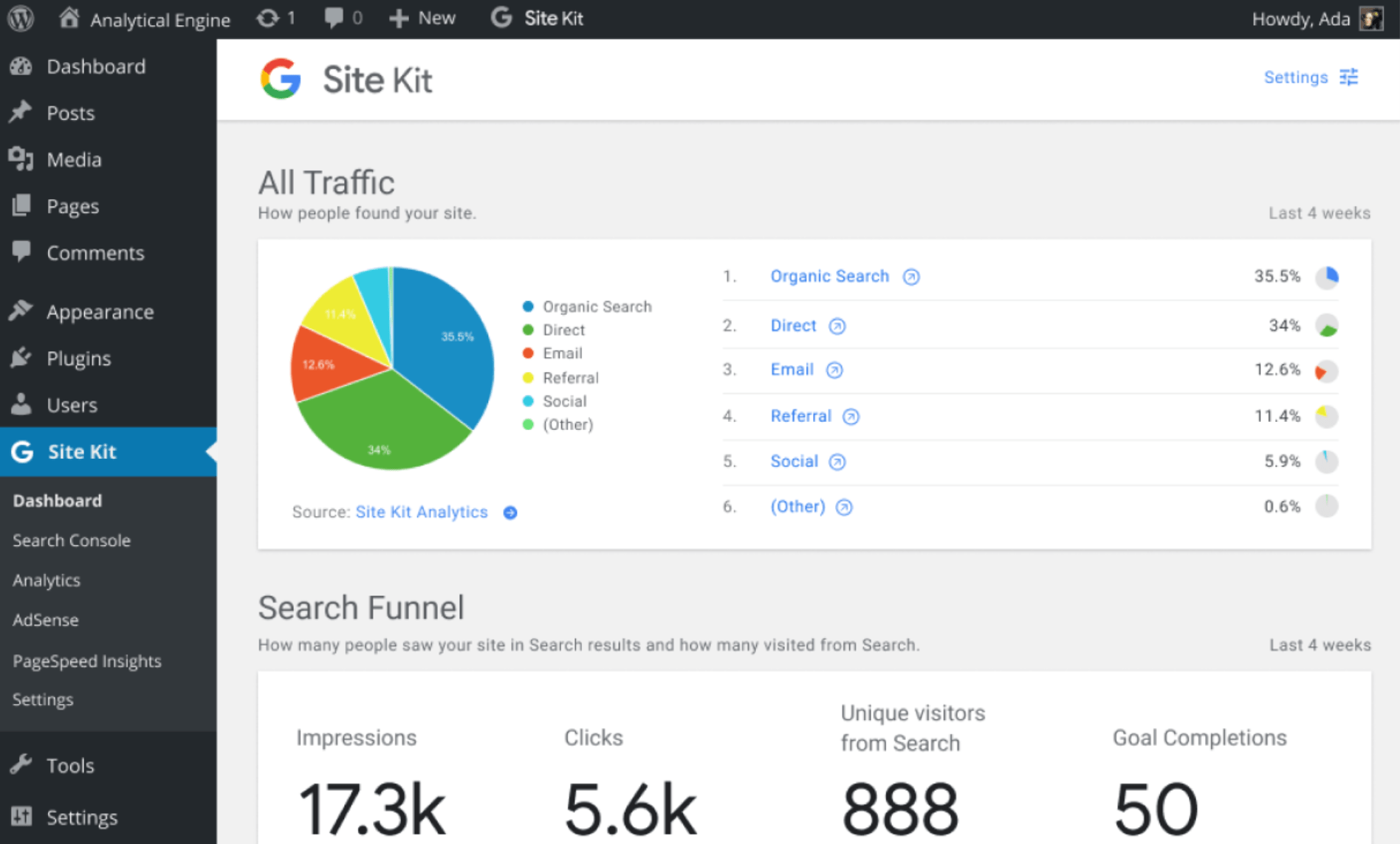 Комплект сайта даст пользователям WordPress доступ к информации и статистике с инструментов Google непосредственно внутри приборной панели. Вместо того, чтобы войти в несколько сервисов Google, чтобы выследить производительность сайта и информацию о трафике страницы, этот плагин агрегирует большинство данных и помещает его под рукой внутри WordPress админ, где это наиболее актуально.