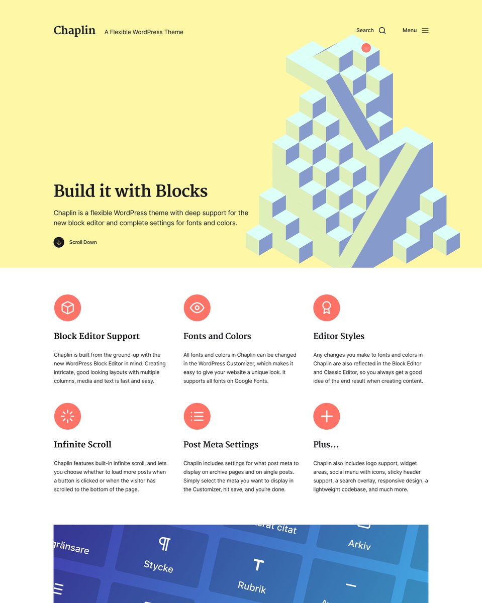Основываясь на реакции сообщества на выпуск Чаплина, ясно, что существует реальный спрос на темы, сделанные специально для редактора блока. Однако, WordPress.org в настоящее время не установлено вверх для того чтобы повысить темы как это.