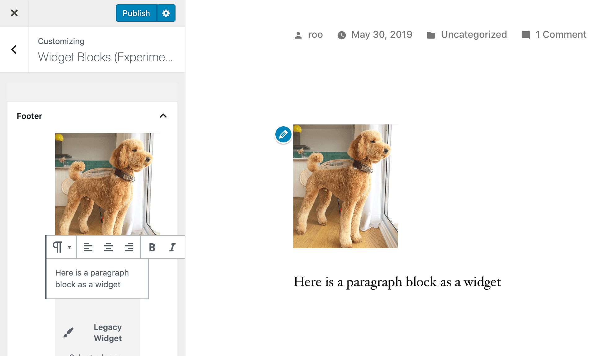 Версия 6.1 также включает в себя больше экспериментов на экране виджетов на основе блоков, который все еще продолжается. Новый редактор блоков виджетов был добавлен в настраиватель под панелью с надписью «Widget Blocks (Экспериментальный)». На данный момент, редактирование виджетов в настраивателе в таком суженное пространство, кажется, не имеет особого смысла. Легко получить элементы управления перемешаны друг на друга. Прямые предварительные просмотры работают, но гораздо медленнее, чем опыт использования редактора поста, и пользователи могут задаться вопросом, почему они не могут просто отредковать содержимое на странице, где он появляется. Важно помнить, что это все еще эксперимент.
