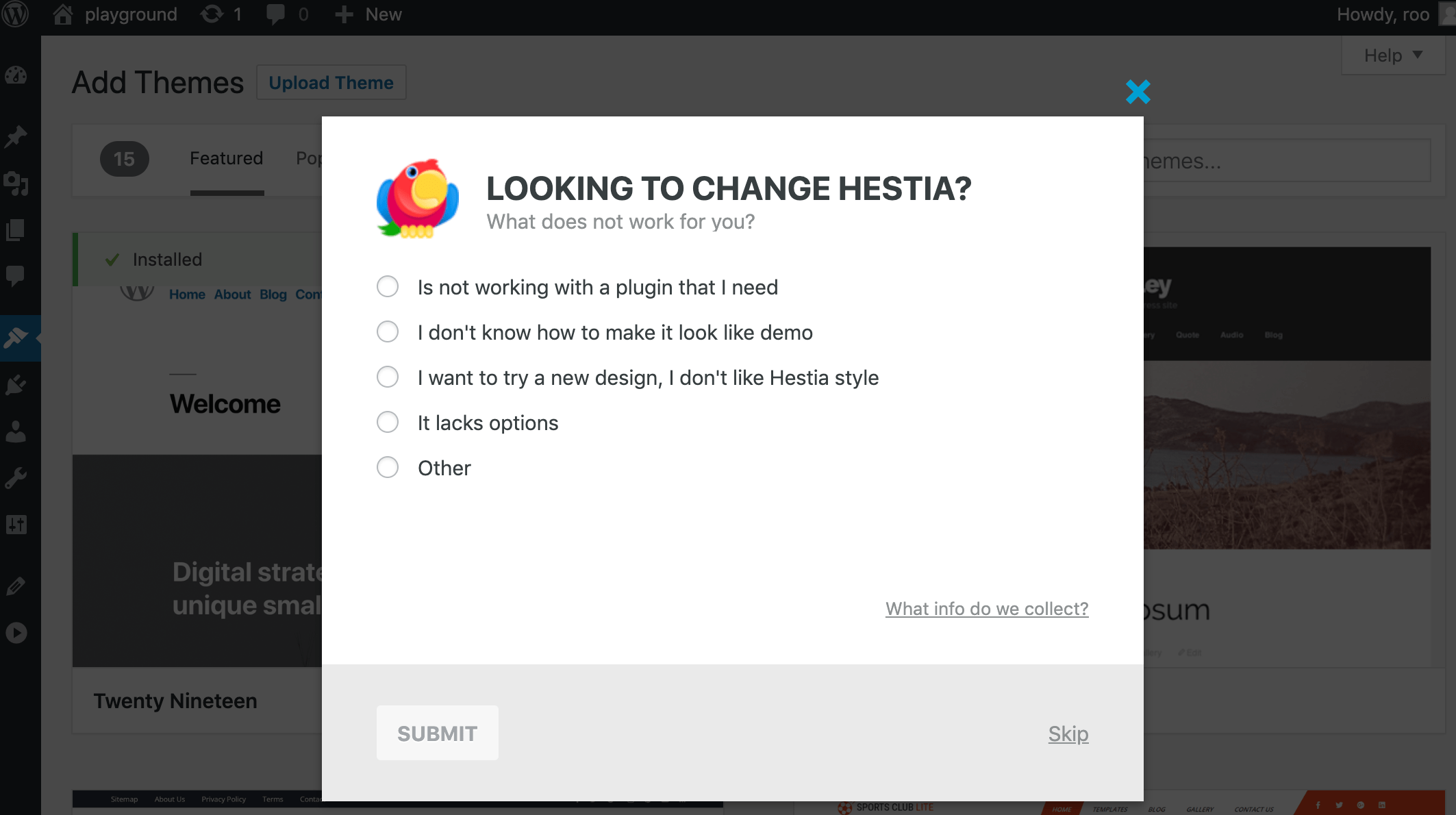 Другим примером навязчивого уведомления является всплывающее окно Hestia, что появляется, если вы активируете тему, а затем перейти к «Добавить новые» на экране темы, чтобы охотиться за другой темой. Купер сказал, что это конкретное всплывающее окно, вероятно, за пределами компетенции этого руководства, но он демонстрирует, что длины тематические магазины будут идти, чтобы лучше рынка их темы.