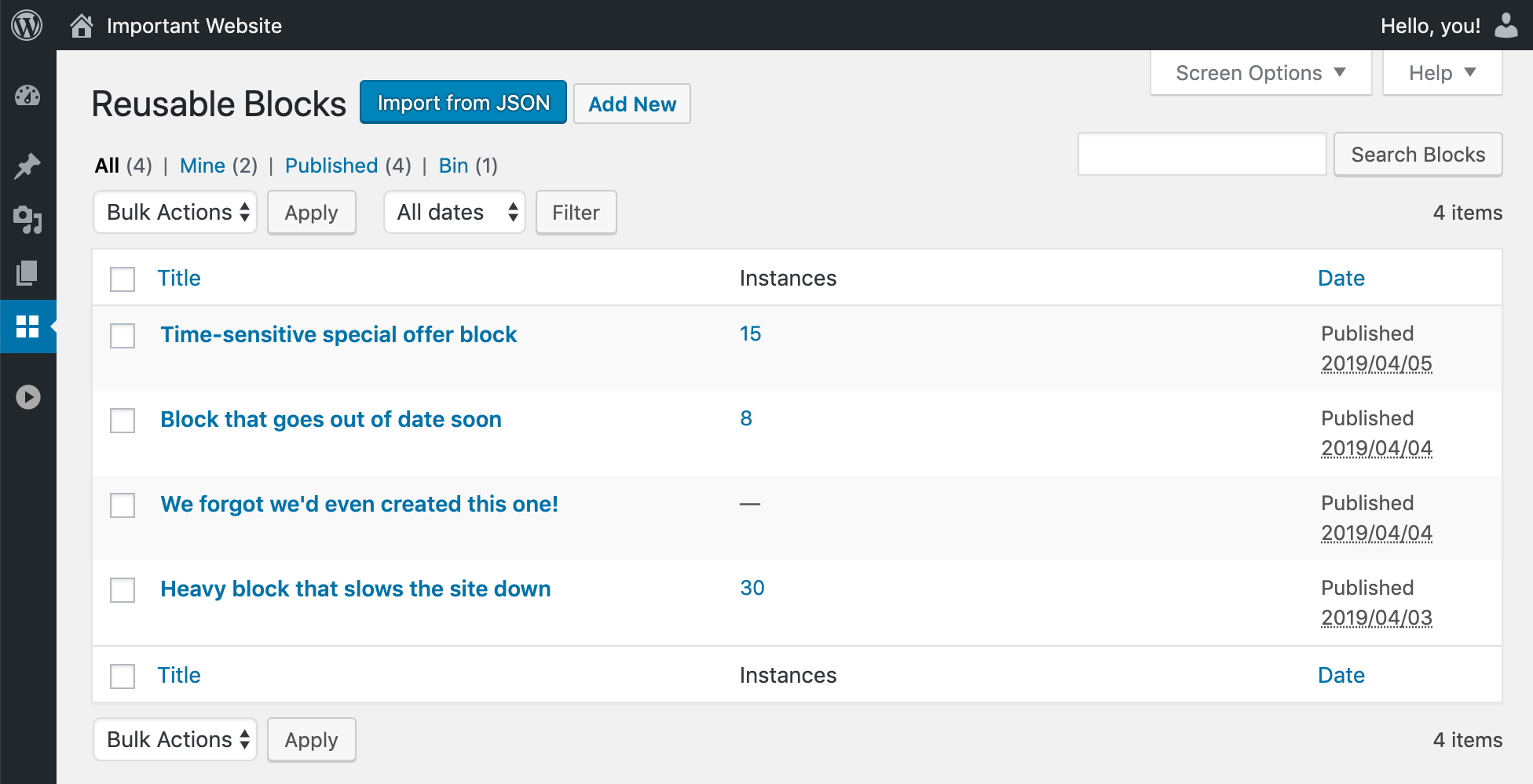 - The Posts, Pages, Blocks, and custom content types that make up your site
