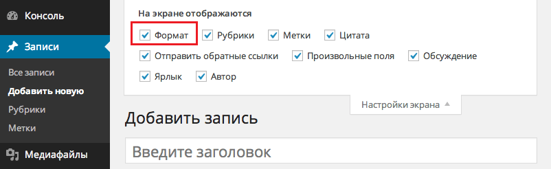 Прежде всего вам следует убедиться, что форматы уже не включены в вашей теме. Для этого переходим в Записи > Добавить новую, затем в правом верхнем углу страницы нажимаем вкладку «Настройки экрана»: