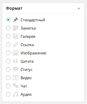 Обратите внимание, порядок форматов в метабоксе соответствует порядку перечисления их в параметре функции add_theme_support().