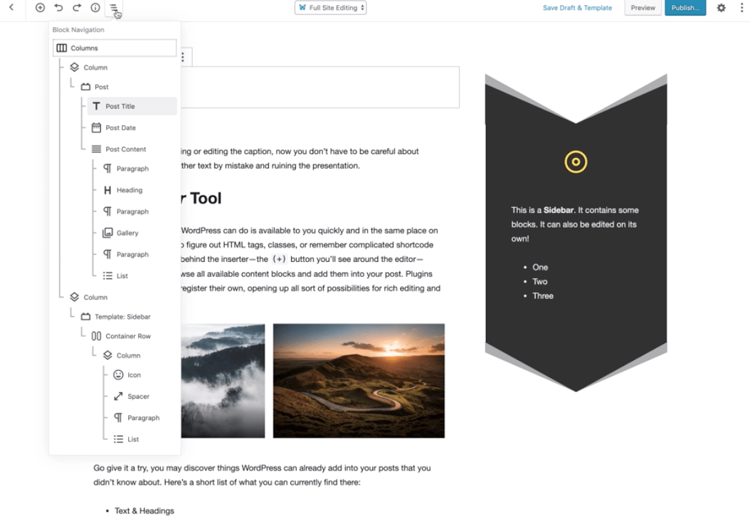 The prototype demonstrates the possibility of drilling down into the individual blocks nested within theme templates and post content. This offers users a better understanding of the page structure and allows them to easily navigate nested blocks.