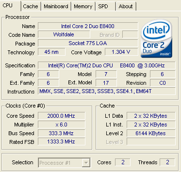 Мы видим, что используется процессор Intel Core 2 Duo E8400, реальная частота которого 3.00GHz, но CPU-Z показывает рабочую 2000.0 MHz. Это происходит из-за снижения множителя и напряжения на процессоре во время простоя (вследствии включения энергосберегающей функции). Если нагрузить CPU каким-либо приложением, то частота будет нормальной.